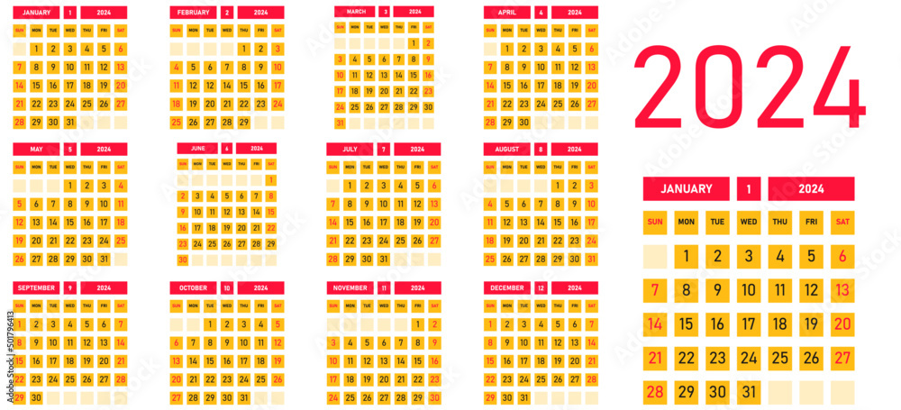 Calendar 2024 year. Colorful vector square pocket or wall calendar