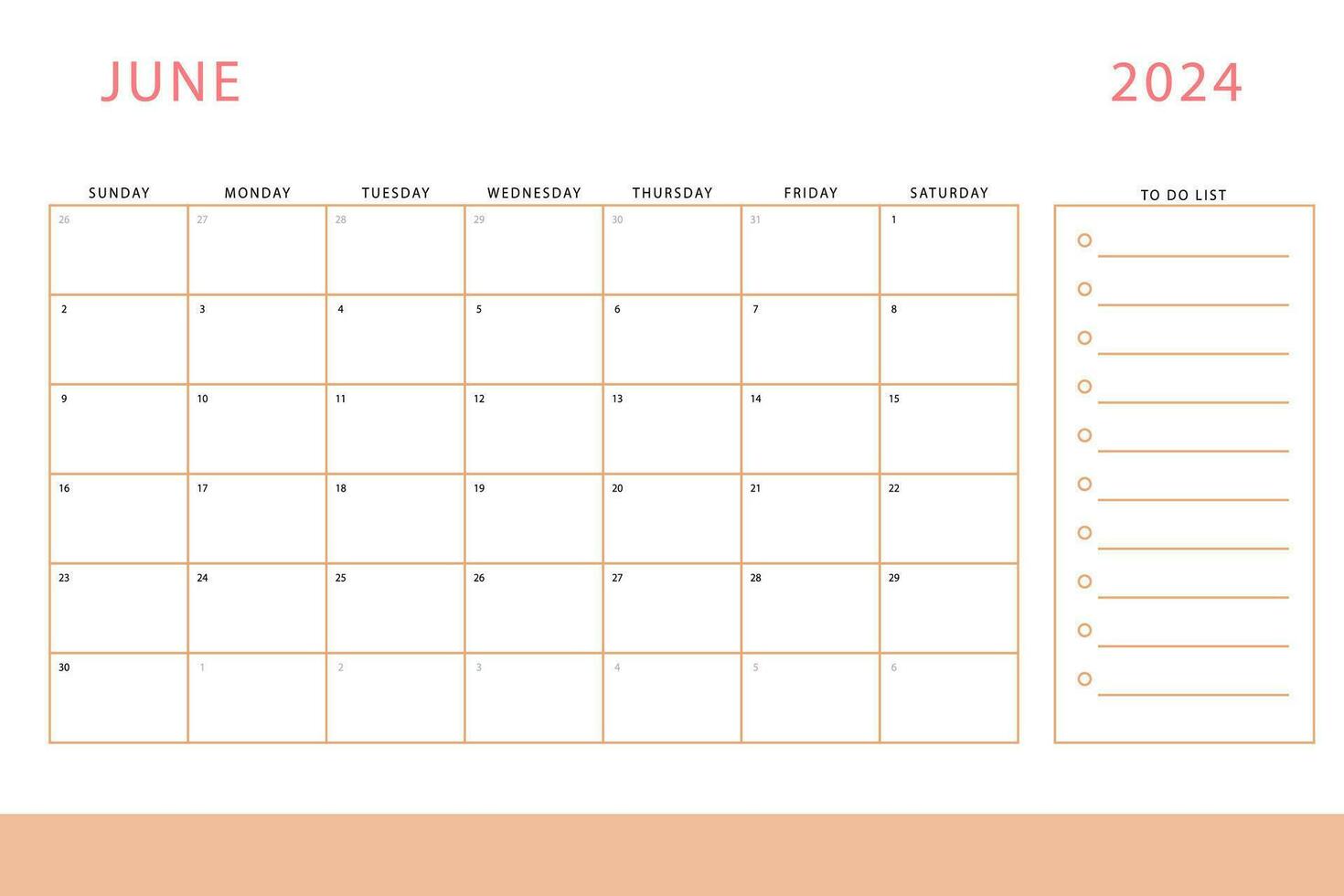 June 2024 calendar. Monthly planner template. Sunday start. Vector
